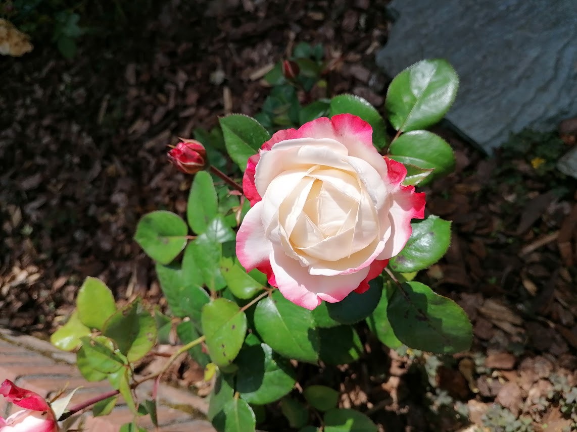 6月くらいに薔薇を見つけて持って帰り植え替えてから、もう3度ほど花を咲かしたが、これまた不思議なことに最初に蕾(つぼみ)が白い時もあり、その時には中側は真紅で、花が開くと赤い薔薇に外側の縁だけが白い、美しい薔薇になるのだ。