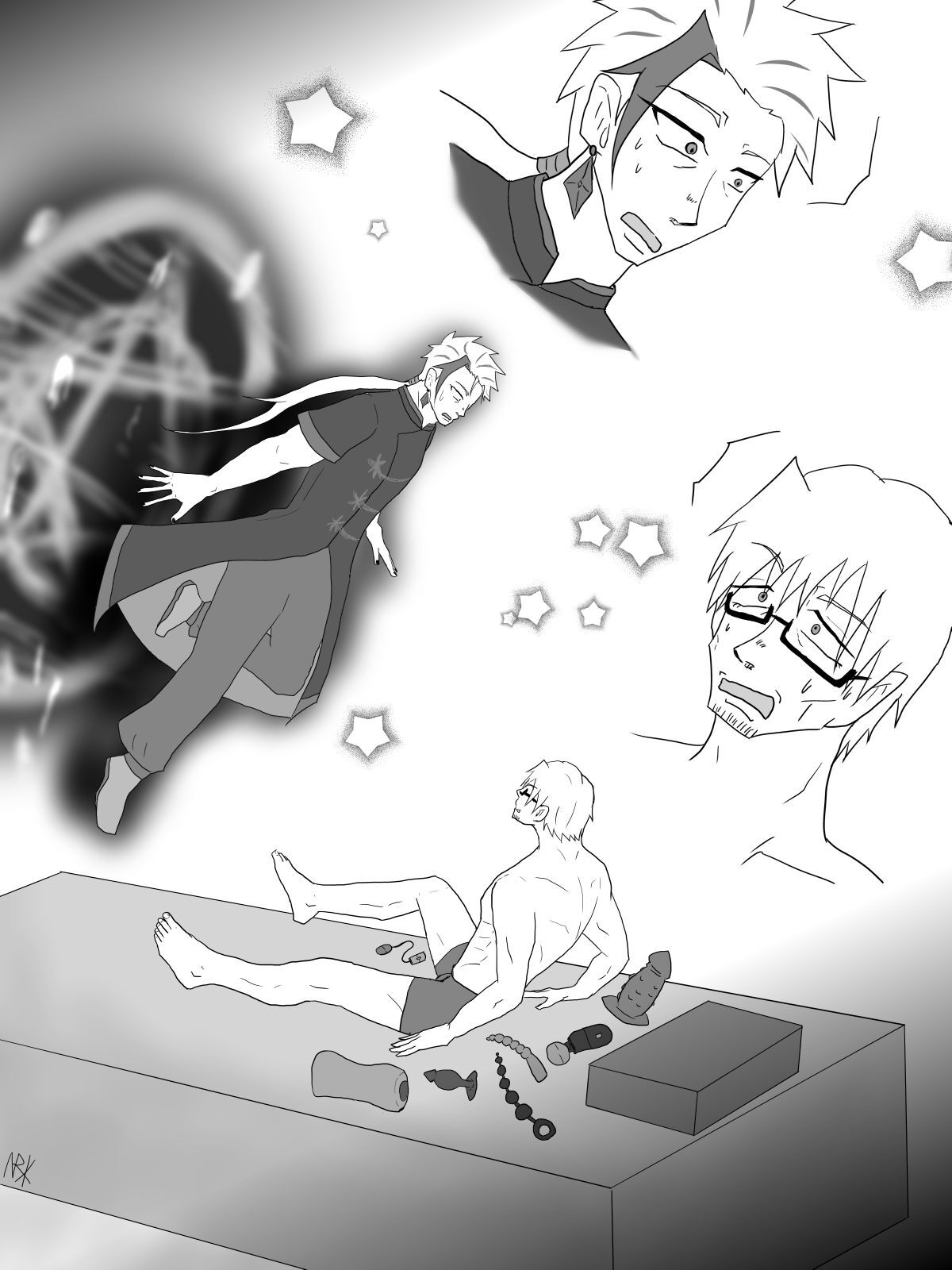 混乱しつつも言い訳をしようとして、はたと、ケイは気づく。目の前のコウヤは半裸であった。くたびれたトランクス一丁というあられもない姿だった。今まで盗撮用のモニター越しにした見たことがない想い人のセクシーショットに鼻血を吹き出し、同時に、この格好ならば自分が感じ取った欲望の気配と合致することに気づいてしまう。