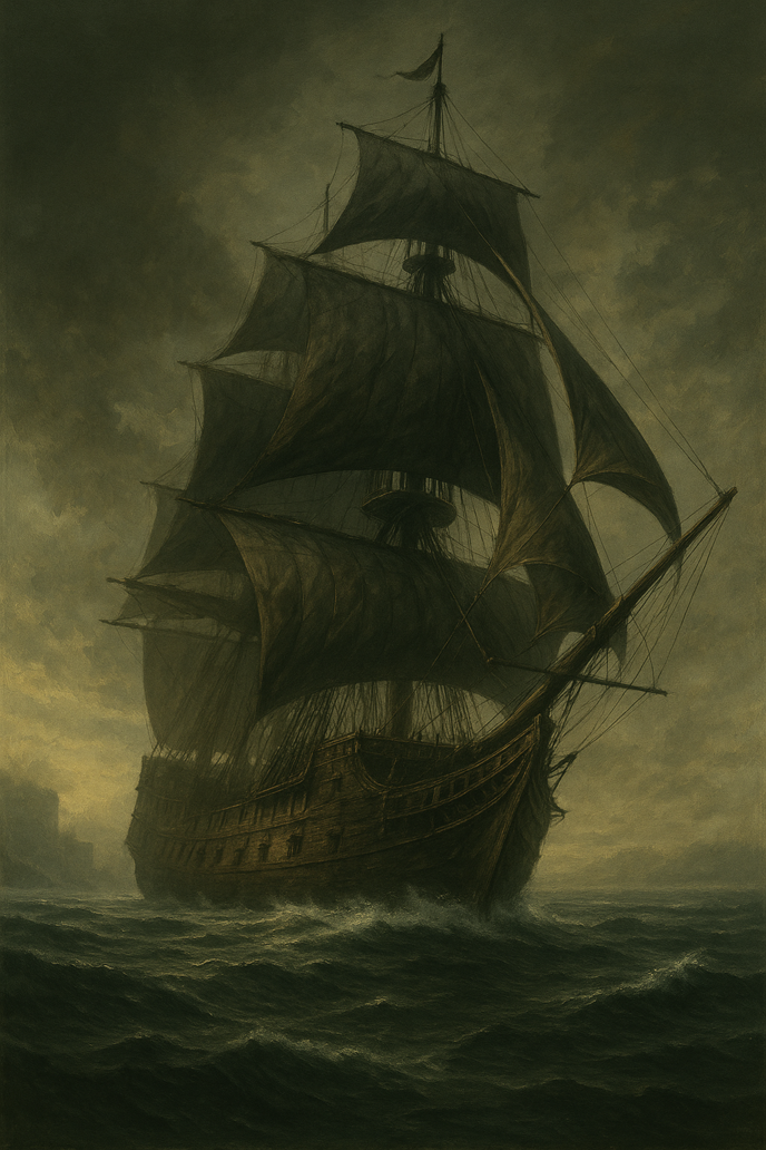 手前に停泊しているのは、全長百メートルを超える黒塗りの巨艦ドロモン船。紋章も国籍も見当たらず、まるでその正体を意図的に覆い隠しているようだった。