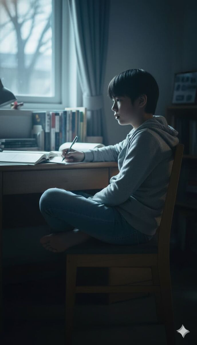 でも、AIのフィルターを通すことで窓からの冬の光がまるで映画のプロローグのようにドラマチックに差し込み、僕の表情には「人知れず深い決意を秘めた少年」のような鋭い陰影が加わりました。