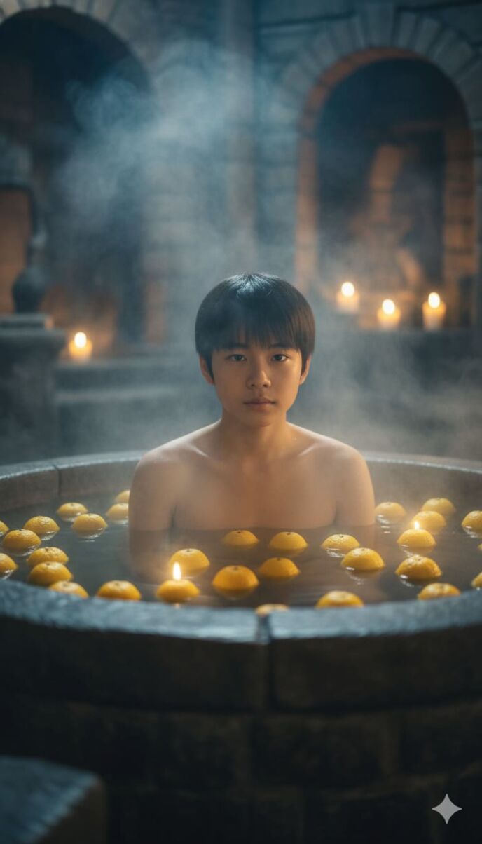今日は母が用意してくれた柚子が浮かぶお風呂に浸かっている自分の姿をスマホで撮り、AIで脚色してみました。