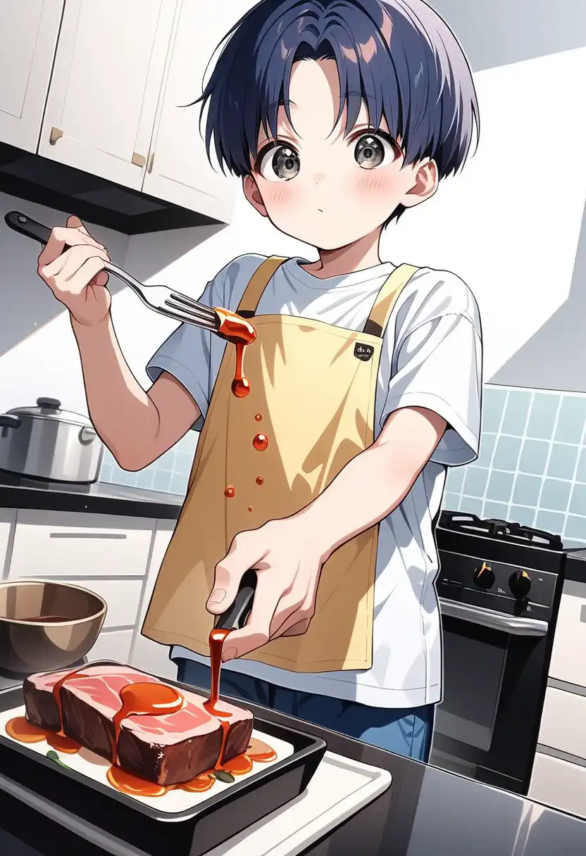 「(エプロンを着けながら)わかりました!(元気よく)任せてください。(フライパンを取り出し)僕がちょっとしたソースを作りますね。楽しみにしていてください」