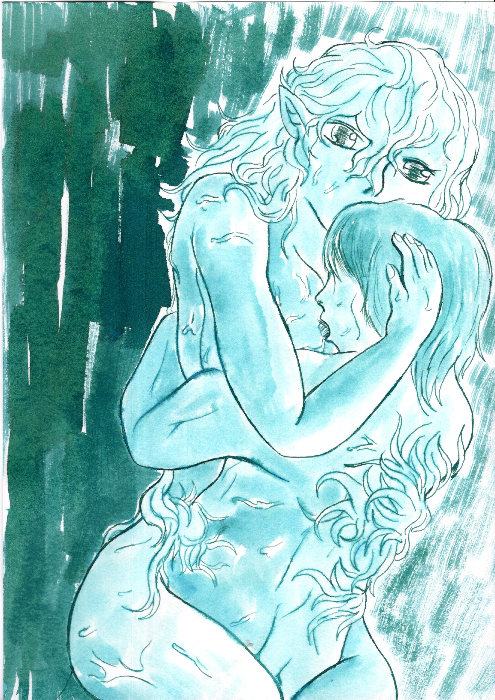 男が強靭な腹筋で上体を起こし、覆いかぶさっていた女体を逆に押し倒す。男のだらしなく開かれた口からは、糸を引いた涎がだらだらと垂れ落ち、女の神秘的な肉体を汚した。それでも、女は嫌な顔一つせず、その繊細な喉から鈴を鳴らすような音色をくぐもらせ、男の求めを受け入れる姿勢を見せた。