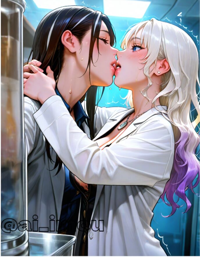 舌で自分の唇を濡らす安奈のデスクに、京子が書類を手にして近づく。身を屈め「室長、最新の解析結果です」と言い切る前に、安奈の唇が京子の口を塞ぐ。安奈の舌が京子の口内に割り込み絡み合う。京子の唾液が混ざり、ガムの甘さが喉に流れ込む。安奈の指が京子の頬を包み、唇を吸い尽くすように押しつける。熱い脈動に安奈の息遣いが荒くなる。京子は安奈を優しくなだめるように唇を離し、淡々と報告を続ける。「5種混合液での不活性化が95%に安定しました」。安奈は火照る顔で頷き、画面に目をやる。画面の赤い点は順調に増え続けている。