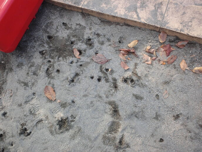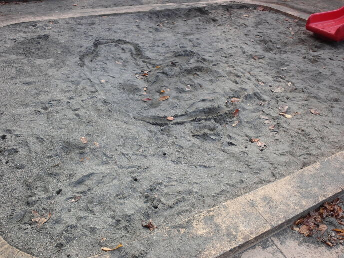 帰宅してからもどうもその事が気になり、夕暮れ前にまた公園に行き、砂場をみて、無事穴がそのまま残っているのを確認して、スマホで写真を撮っておきました。ヒールで掘られた穴のほかにトゥの部分の形も残っていて、tramplingファンの私には久しぶりにみる素晴らしい造形でした。