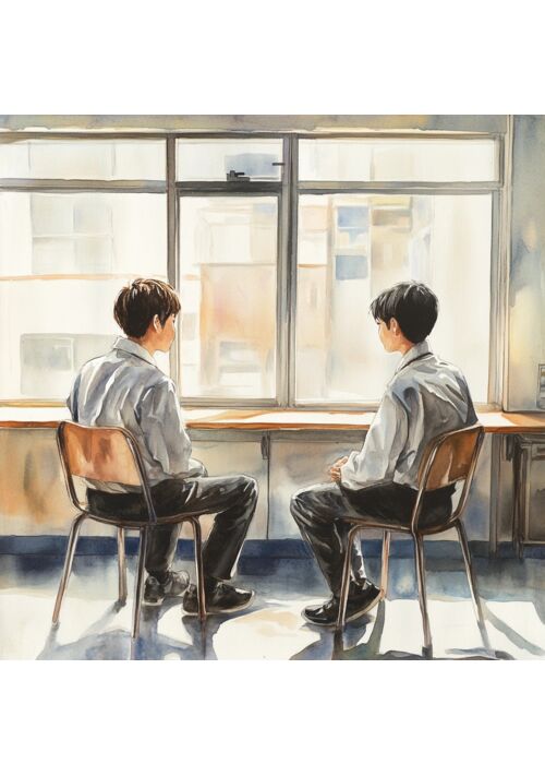 「気になるあの子は隅っこに」 颯太はクラスの中心的存在だが、静かに本を読んでいる文也にひそかに興味を持っています。ある日、思い切って文也に話しかけたことをきっかけに、二人の距離は少しずつ縮まっていきます。友情が芽生え、互いに影響を与え合う二人のやり取りが描かれる物語です。