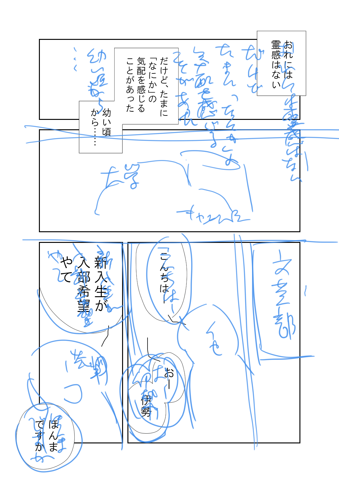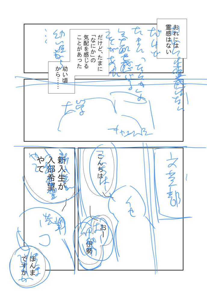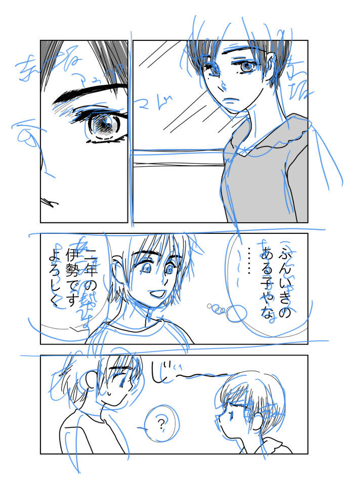 一応、十頁目までは一気にネームやったけど。ネームが下書きで、青い線で描いてあります。