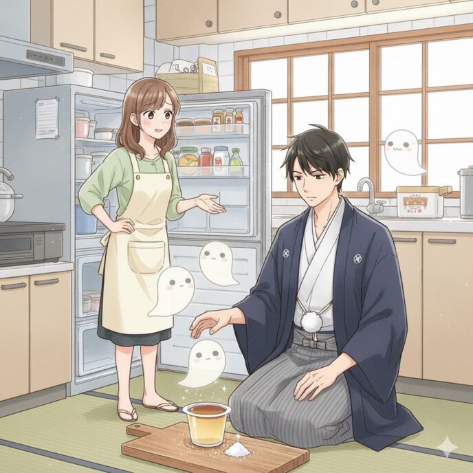 「ふむ、これでよし。未練の霊は浄化された。この冷蔵庫内は清浄な気に満ちている」