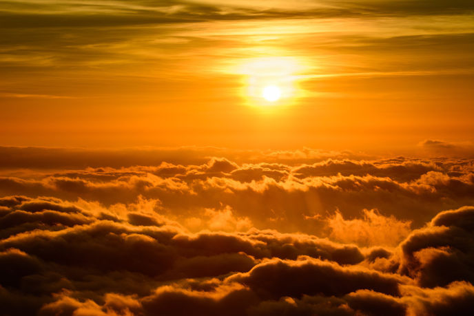 灰色の雲を抜けると、雲の上、茜色に染まった空が顔を出す。眼下には茜色の空の色を反射した雲が、何処までも広がっているかのように、地上を覆っていった。