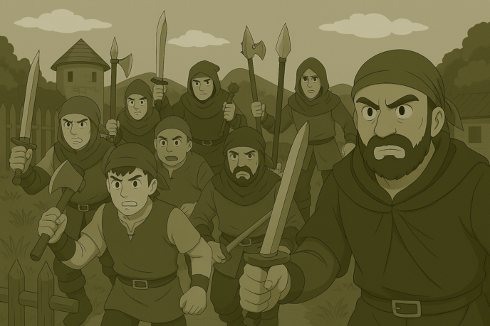 **農耕兵たちが堀の向こうで武器を構え、緊迫した空気が漂う農園の入り口**。
