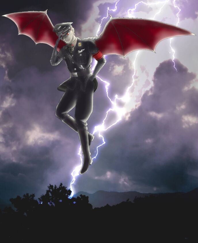 そうルーデルが叫んだ瞬間、背中からは軍服を突き破り片翼だけで2mはあるだろう巨大なドラゴンのような翼が生え、腕は硬質な鱗に覆われ手は鋭い鉤爪を持った恐竜のように変化した。