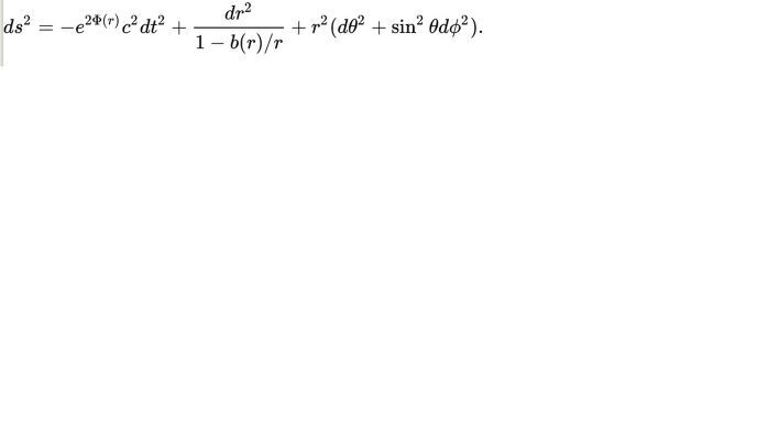 この数式において、 Φファイ ( r ) は 重力赤方偏移の尺度、b ( r ) はアインシュタイン-ローゼン橋(はし)の3次元形状と定義する。