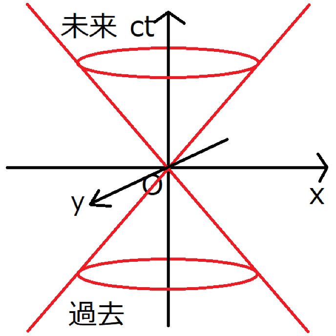 は、横軸に場所、縦軸に時間をとり、原点に観測者を置いた空間のことである。ミンコフスキー時空上の直線の傾きは、物体の速度を表す。特に、縦軸をでとっているため、光速の傾きが45度になる。この光速を表す線を母線とする円錐を、光錐