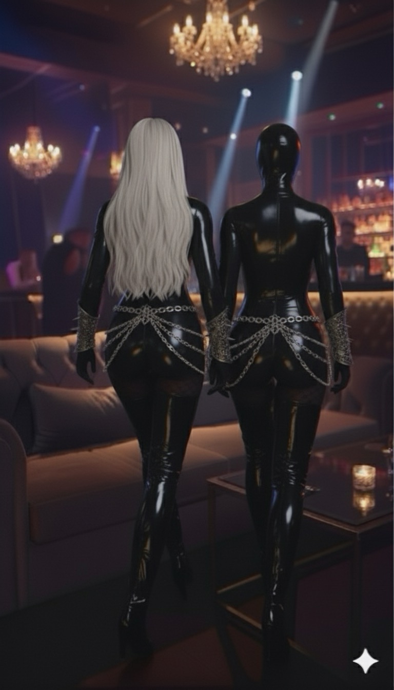 胸元に当てた瞬間、ラバースーツの艶やかな黒に銀の文字が映えた。