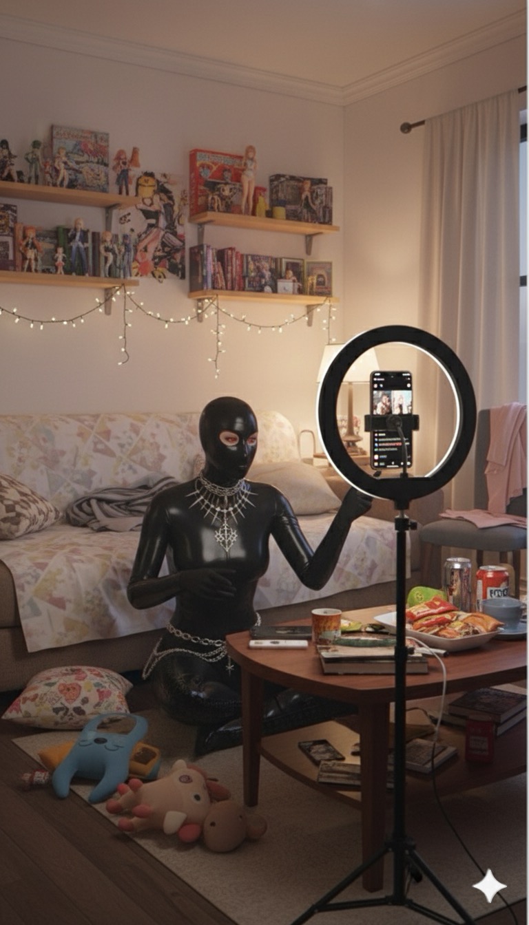 悟は布団に横たわり、スマホを手にしてラバーマスクガールの配信を眺めていた。