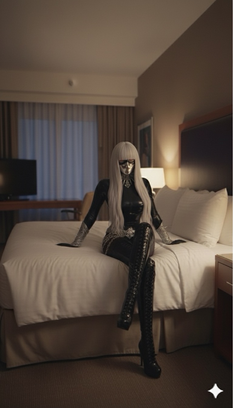 ラバーの光沢にシルバーの装飾がきらりと揺れるたび、空気が張り詰める。