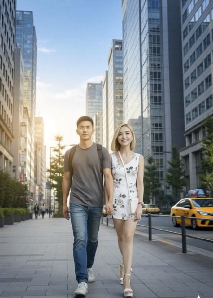ビルのガラスに映る二人の姿は、都会のざわめきの中で、どこまでも穏やかに寄り添っていた。