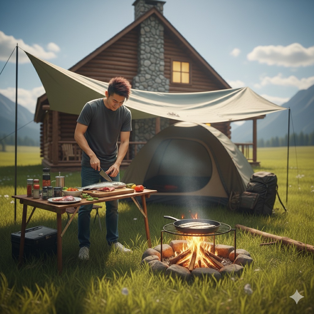バーベキュー用のグリルや網、簡易コンロが並べられているが、悟にかかればこれも立派な調理道具だ。