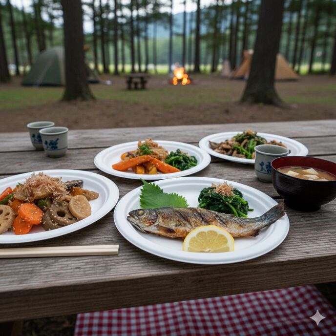 森の中に、香ばしい焼き魚と煮物の香りが漂い、三人の笑顔と感動が静かに混ざり合う。