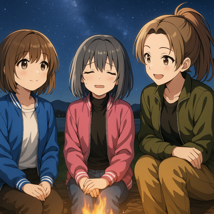 夜の帳が降りるころ、焚き火の炎がゆらめき、星空が果てしなく広がっていた。