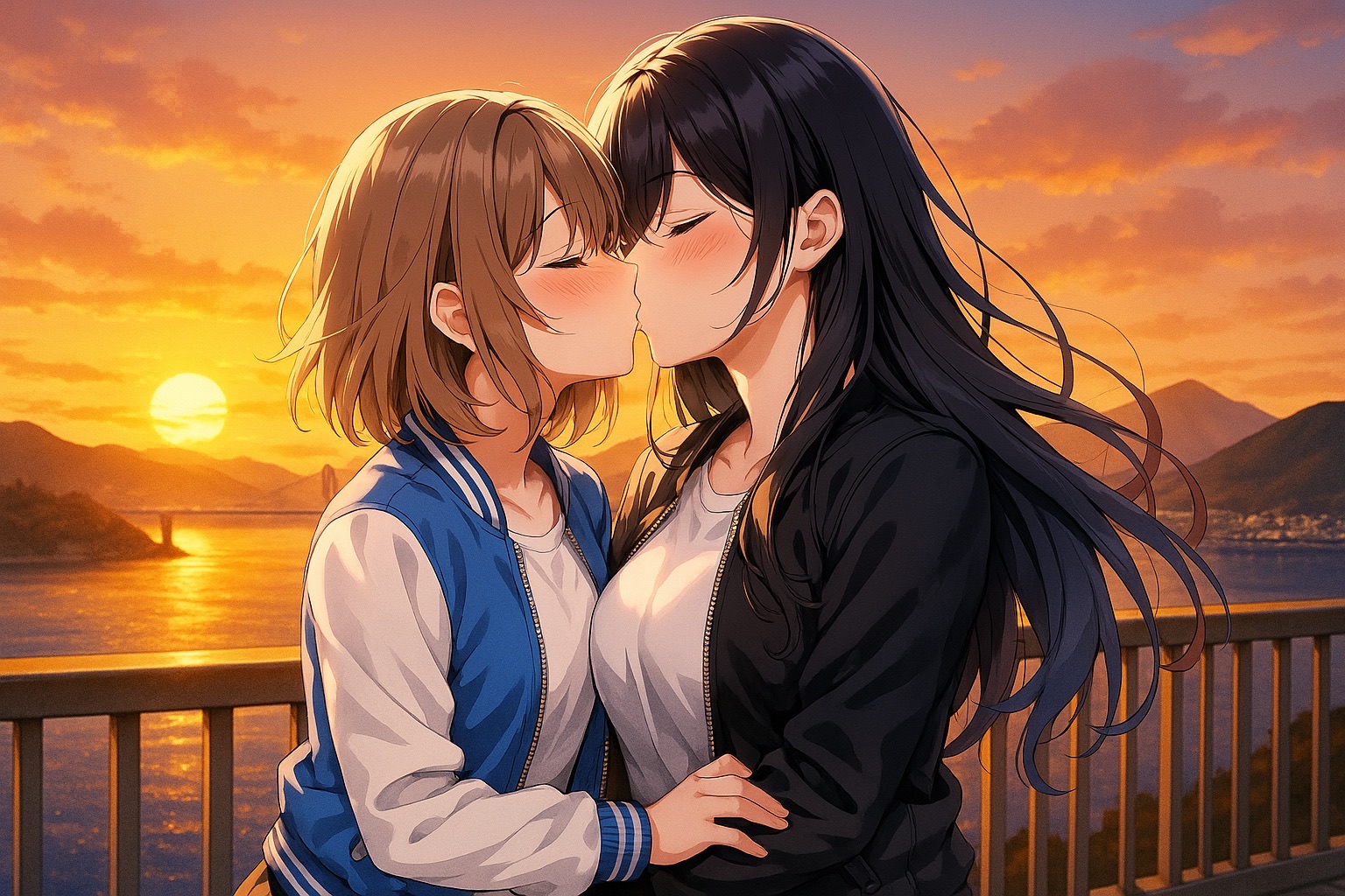 広場に着くと、風はほんの少し冷たくなっていた。橋桁の向こうで、赤と金のグラデーションが水平線を満たし、吊り橋のケーブルが弧を描く。バイクを止めた凛が先に降り、結はタンデムシートに腰を下ろしたまま、額のシールドを上げる。