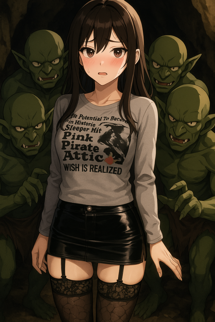 睨見つけた視線に恐怖を感じ椅子に鎮座する一際大きなコブリンを目の前にする。 そして… 「オマエ、メスか。」 「ココ、メスイナイ」 「オマエ、コドモウムタメキタ」 「オマエ、テイコウシナケレバ、イノチタスカル」 「えっ!?」 その言葉の内容は私としては想定内のセリフだがそれ以上にこのゴブリンだけ人語を話したことに驚きを隠せなかった…。