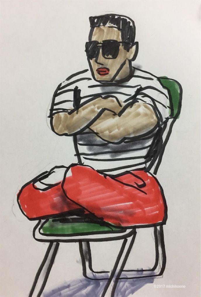 パイプ椅子にあぐらで座った