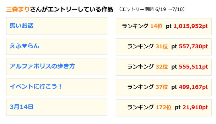 エントリー作品一見多そうに見えますが タグつけたまま 更新してない作品も多いので元気に更新できたら けっこういい感じに上位に食い込めます