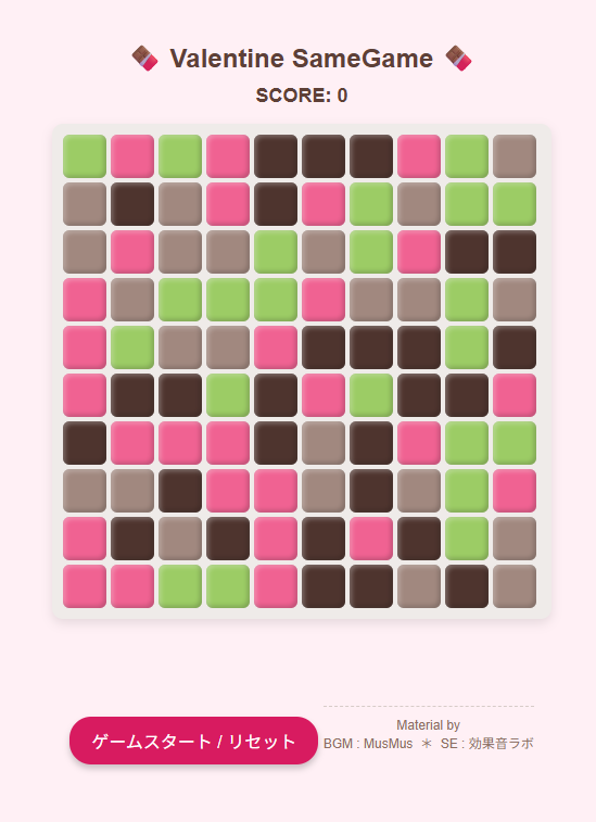 (・∀・)「「さめがめ」バレンタインバージョン作ってちょうだい(*^^*) HTML書類で コマの色をチョコ色で 「茶色」「明るい茶色」「ピンク」「抹茶」 MusMus-BGM-189.mp3 (BGM) clear.wav (消去時の効果音)」