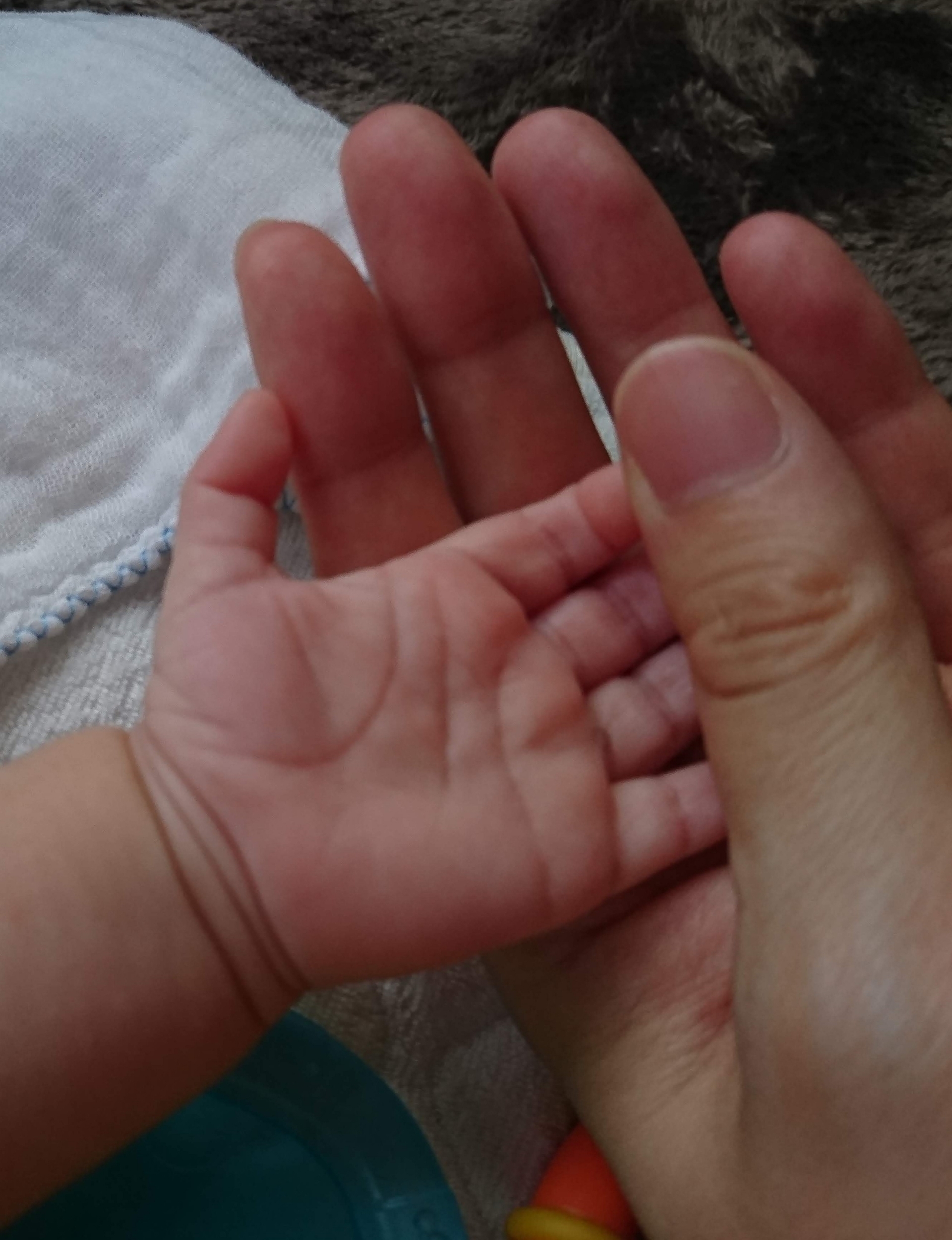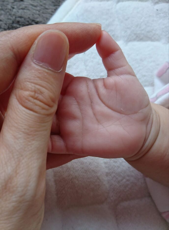 (右と左それぞれ。生後2ヶ月直前の画像だが、生まれて3日目にこの手相に気付いた。5歳になった現在も離れ型は変わらない)