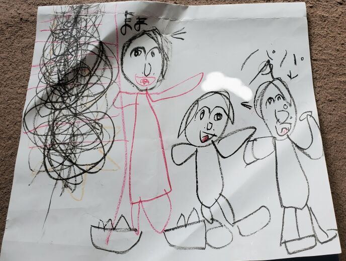(夢の中の戦いにより?落下した、娘の描いた絵。娘の名前部分のみ、加工済)