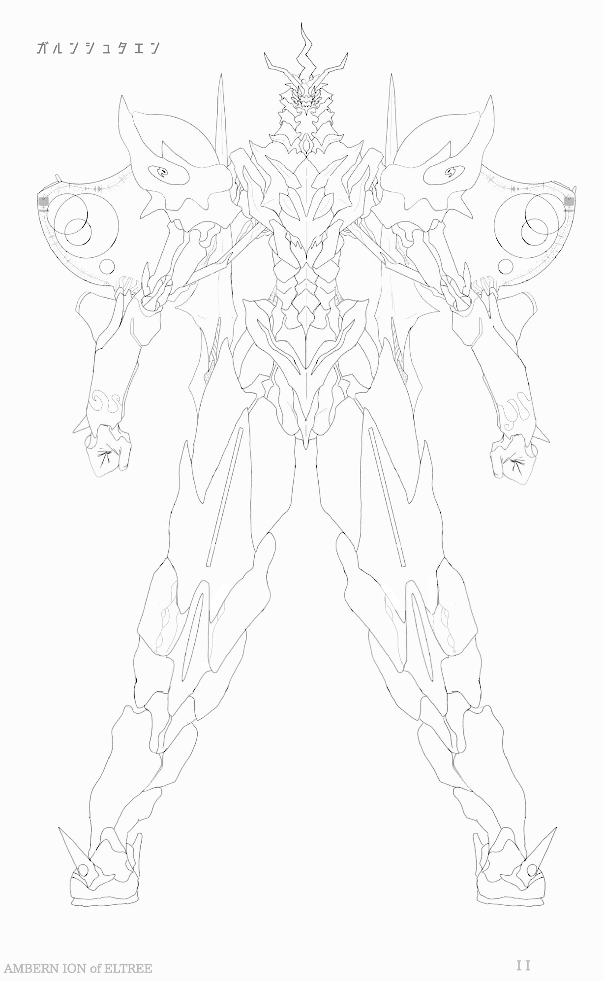そのダメージには無頓着なエシュタガ。ガキンと音がして、ガルンシュタエンの左腋の下から火花が散り、腕のエネルギーラインがオレンジ色の輝きを失う、そしてアンバーニオンを掴んだままで左腕は機能停止した。
