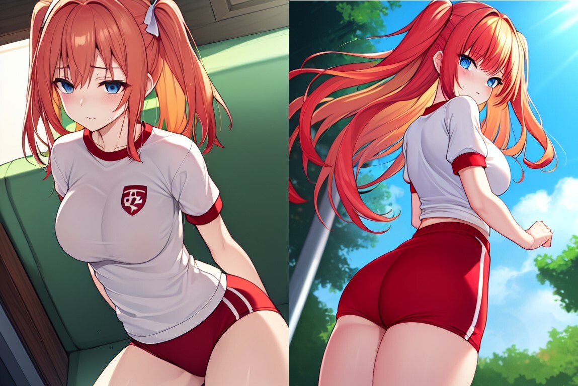 ちらっと着替えている子達の服装を見ると、上は白い体操着に下は臙脂色のブルマだ……。マジかよ……。この体だから許されそうだが、普通に考えたら犯罪だろ? アリアめー、さっきは見直したけど後で絶対何処かに埋めてやる。しかもかなりぴちっとした服装。ラインが出まくりだし、最早陸上選手のレーシングブルマだ。キッツ―! 何で今日日ブルマなんだよ、絶対あいつの趣味だな。