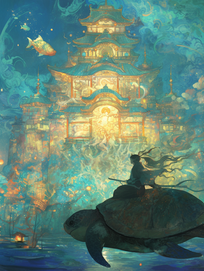 亀は満足そうに頷き、自らの甲羅を傾けて浦島に背中へ乗るよう促した。浦島が恐る恐るその背に乗ると、亀は海中へと滑り込んでいった。その瞬間、冷たい水が浦島の肌を包み込むが、不思議と心地よい感覚が全身を満たした。