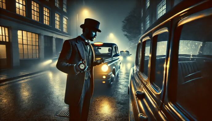 男はタクシーから降りると、懐中時計を掲げ、塔の方向に向けた。