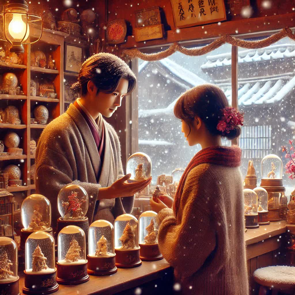棚には、スノードームがずらりと並んでいた。雪景色のもの、夜空にオーロラが浮かぶもの、ちいさな家と犬が寄り添うもの――どれも、見たことのない細やかさで、一つひとつがまるで物語を閉じ込めているようだった。