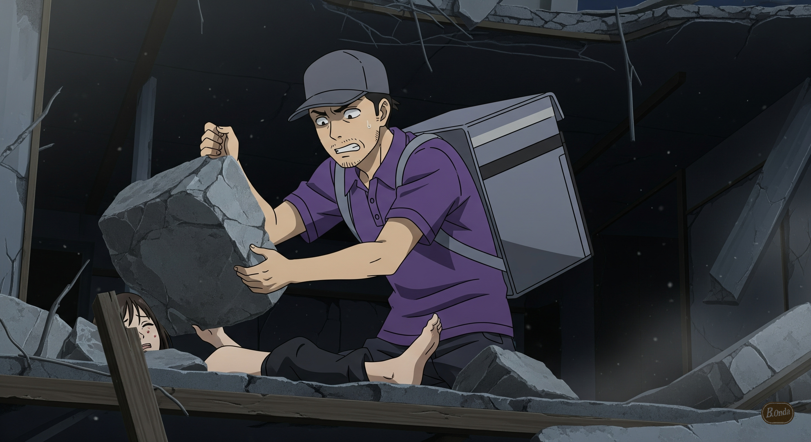 若い女性だった。片足が瓦礫に挟まれ、顔は汗と涙で濡れている。