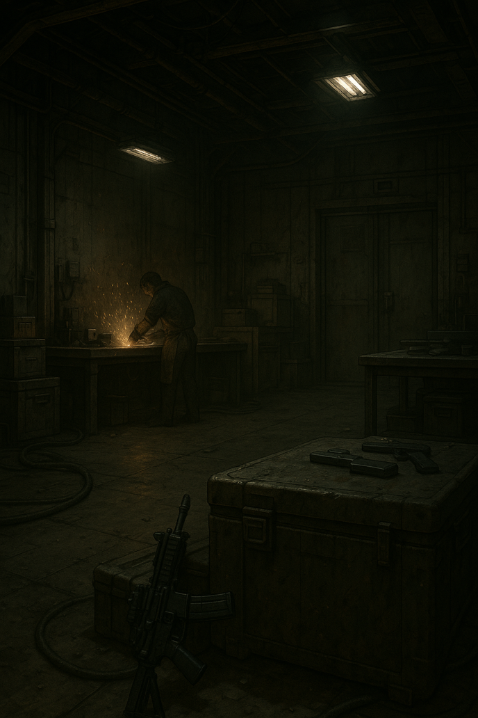 分厚い防爆エプロンを着込み、黒く煤けた手で焼け焦げたライフルを分解している。