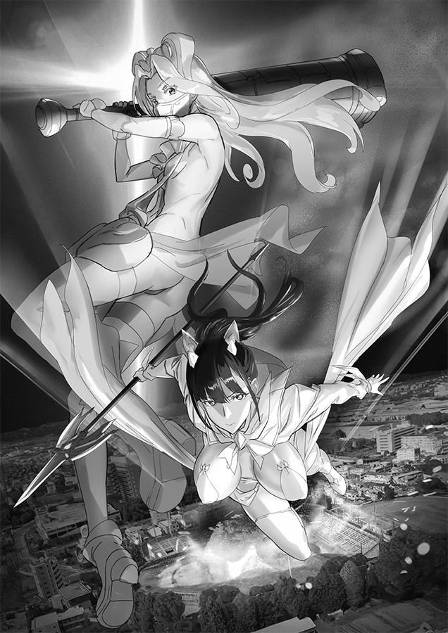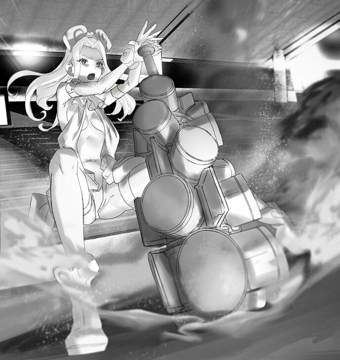 下降する金髪少女の持つ獲物、大型の棍棒は変形が開始する。側面にいくつものパネルが開き、そこからロケットノズルが顔を出す。そのノズルから噴き出す炎で、彼女の体はさらに加速する。木須屋の追跡が間に合わない。