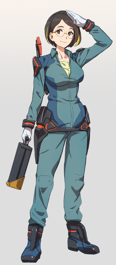 遺物課支給の青のつなぎの上に簡易型のエグゾスケイルアーマーを装着している。彼女がこの遺物回収ミッションの監督管だ。