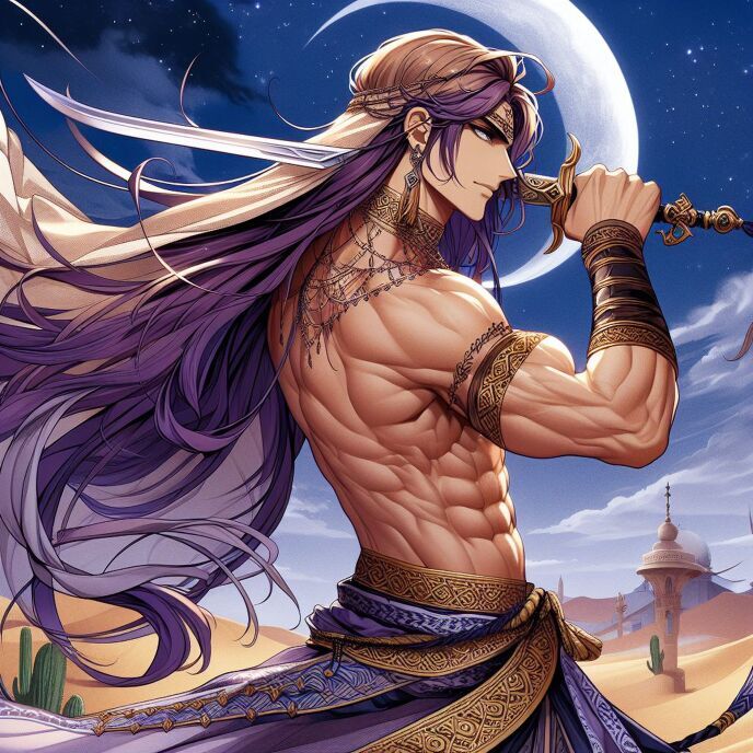 青年の手に光る銀のシャムシェールは、夜空に浮かぶ三日月。