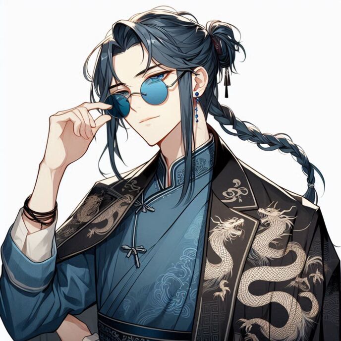 長く青い髪を無造作に結い上げ、先の方は緩い三つ編み。色付きの丸眼鏡に通った高い鼻梁。病的なまでの色白さと、それにそぐわぬ細いが均整の取れた身体にすらりとした四肢。濃い藍色の長袍には、龍の紋様が入っている。黙っていれば、雑誌から抜け出て来たモデルのような青年だった。