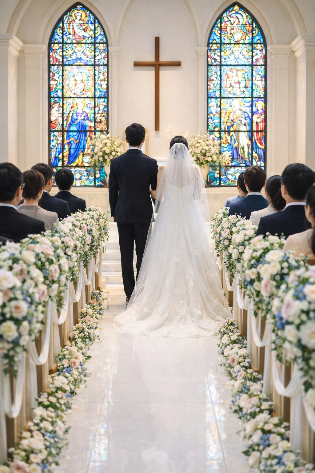ウエディングドレス姿の美咲が、父親の腕にそっと手を添えて入場してくる。