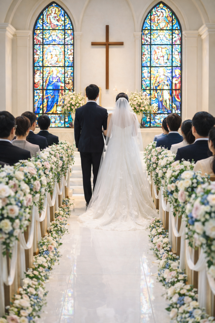 音楽が変わり、参列者の視線が一斉に扉へ向かう。
