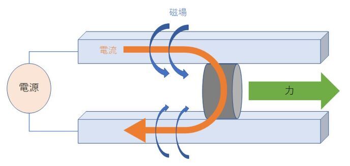 伝導体2本とその間に飛ばす弾(弾も伝導体)を用意して電流を流す。そうすると、磁場が発生し弾に力(ローレンツ力)がはたらく。『フレミングの法則』と同じ原理だ。