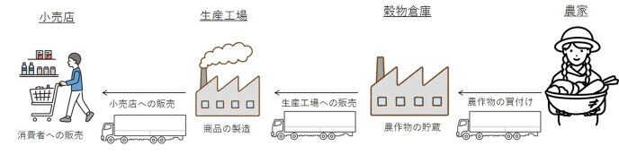 王国が買い上げた農作物は各地の倉庫に保管され、商社や食品工場に一定の利益率を乗せて販売する。食品工場が製造した食品が小売店(スーパーマーケット)に卸され、小売店で最終消費者に販売される。
