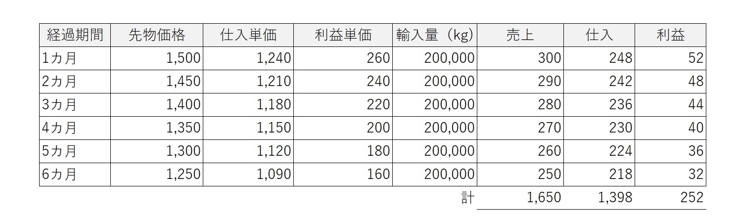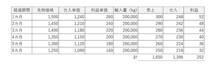 「取引開始時点で1カ月から6カ月の銅先物を売れば、損失を出さずにすむ。先物価格は1カ月1,500JDから6カ月1,250JDまで下がるけど、6カ月間で2億5,200万JDの利益が出る。」と俺は言った。