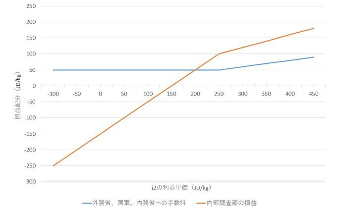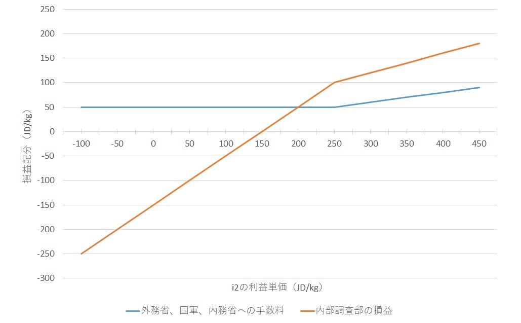 例えば、i2の利益(単価)が100JD/kgの場合、利益の20%は20JD/kgだから、最低保証額(単価)50JD/kgよりも少ない。この場合は、外務省、国軍、内務省に50JD/kgを手数料として支払うことになる。