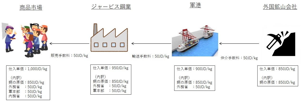 「現在の銅の国際価格は800JD/kgだ。外務省のダミー会社がサンマーティン国の鉱山会社から850JD/kgで仕入れ、i2が外務省のダミー会社から900JD/kgで購入する。これは、サンマーティン国の会社と外務省に対して、50JD/kgずつ手数料を落とすためだ。」