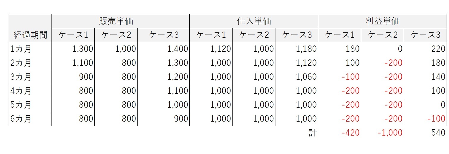 「ケース2は、開始から2カ月で銅の国際価格800JD/kgまで下がった場合の、仕入単価と利益単価を計算したもの。ケース3は、銅の国内現物価格が1,500JD/kgから毎月100JD/kgずつ減少した場合の仕入単価と利益単価。」とルイーズは言った。